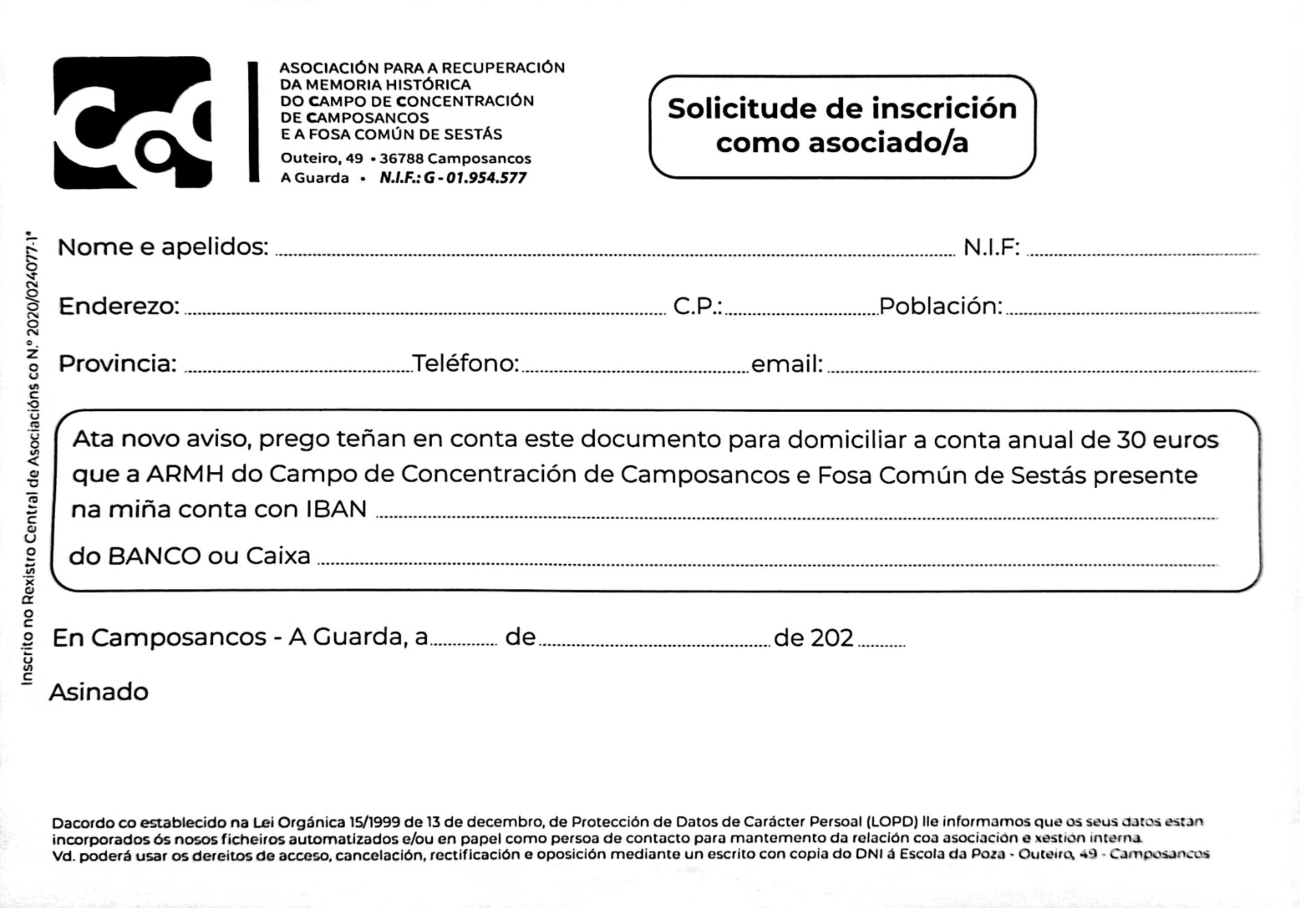Descarga e imprime o arquivo PDF no enlace de abaixo, unha vez cuberto, faille unha foto e nos a envías ao em@il: info@campo-concentración-camposancos.es. Da a orden para o pago da cota anual, a través da banca electronica do teu banco, ou entregando no mesmo a ficha cuberta.